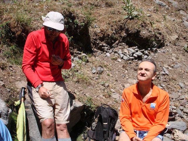 Coco y David disfrutan del picoteo y la vista de la cascada.