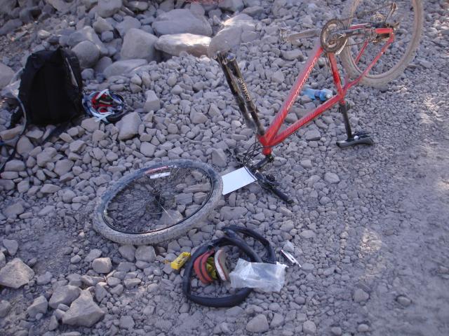 Pobre rosita. Pinchazo en la rueda delantera. Cambio cámara y en minutos estamos en la ruta de nuevo.