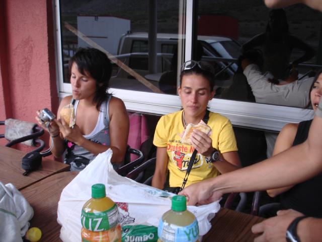 La Cako (que se sacó la cresta en el km5 y con mucha valentía llegó pedaleando hasta el km 60! Bien Cako!), Cony (que pedaleó como una verdadera machine!) y Gaby (mi crédito...) esperando la cena con sanguchitos, jugo y conversa.