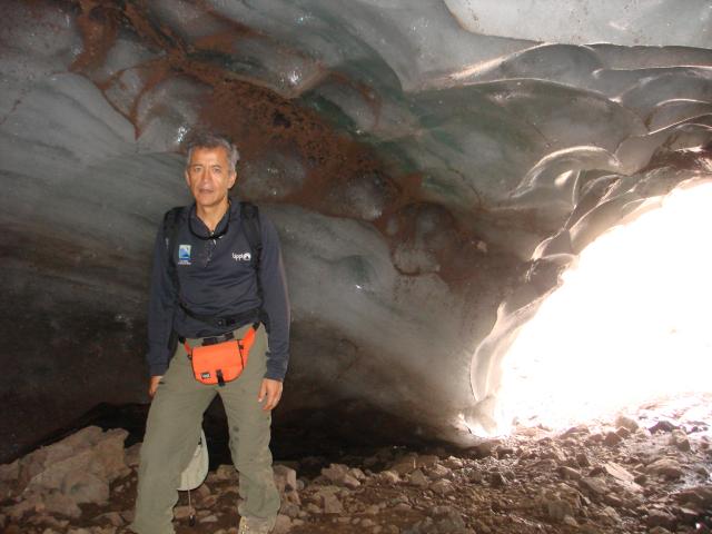 Hay franjas horizontales en el hielo que muestran diferentes capas del hielo.