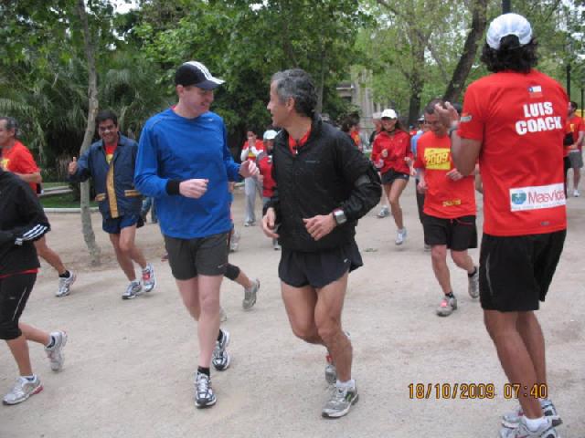 Precalentando para los 10K de la Nike junto a Andrés. Luis nuestro coach nos anima en una heladísima mañana. Dudo si sacarme el cortavientos...
