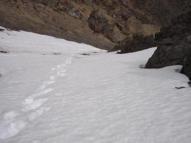 (15:33) Bajando no encuentro el sendero 'normal', e improviso una bajada por este nevero. Hay huellas, asi que parece que se puede... Me preocupa un poco no sabe como termina, si hay barrancos o rocas. Ojalá no haya que devolverse...