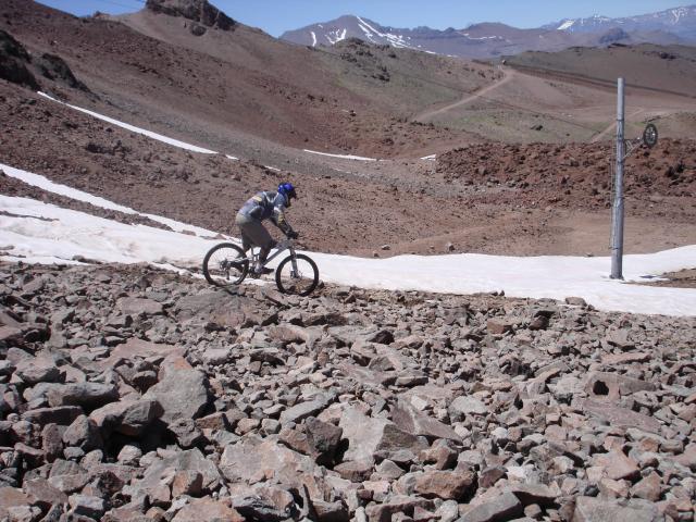 Ya bajando el portezuelo veo que el andarivel de silla está funcionando. Trae a cleteros para que hagan su downhill. Scary! Se tiran con todo por los senderos en los que caminar ya es duro...
