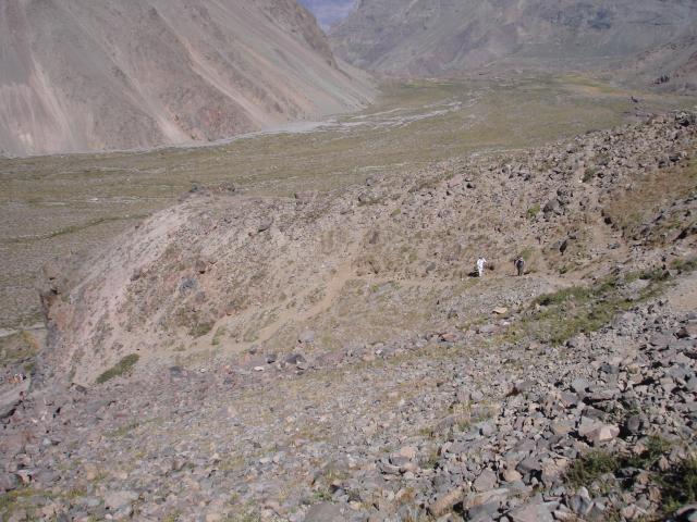 Ya subiendo la quebrada. Poncho y Yovanni avanzan por el sendero.