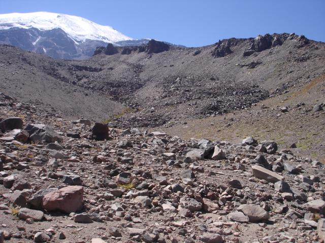 El refugio a la vista, confundido entre las rocas en la vega al centro de la foto.