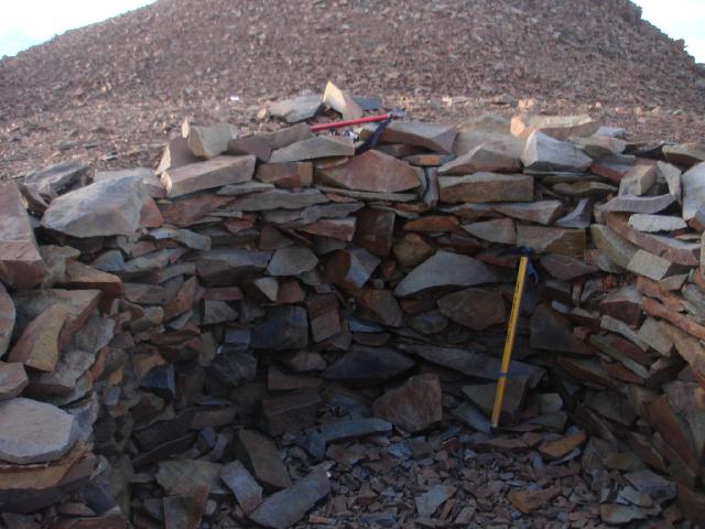 7:10 am. Ya en la pirca. Aquí hace un frío padre. Las manos duelen. No hay muchas fotos del ascenso del acarreo. No dan ganas de sacarse los guantes para manipular la cámara...