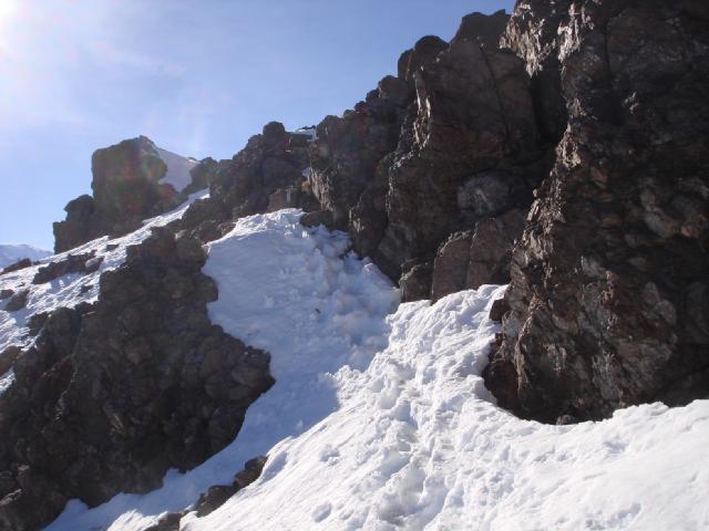 El sendero muy marcado. La nieve todavía un poco dura.