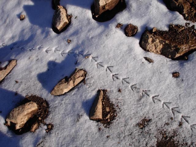 Después del Alto, hay una capa degada de nieve en el sendero. No hay huellas de otros caminantes, salvo el pajarito que dejó esta linda huella...Al parecer voy abriendo la ruta nuevamente.