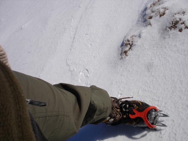 Decido ponerme los crampones, que apenas dejan huella en la nieve dura.