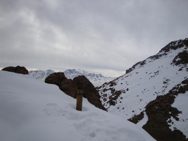 El entrenamiento de ayer con los VRT se siente en los 'tutos'. Por circurstancias entrené dos veces, incluyendo una con subida al cerro. Me duelen un poquito las piernas con el esfuerzo de la subida, pero sigo a mi ritmo. Un montañista me advierte que arriba la nieve está dura como para crampones, pero yo la encuentro impeque. |