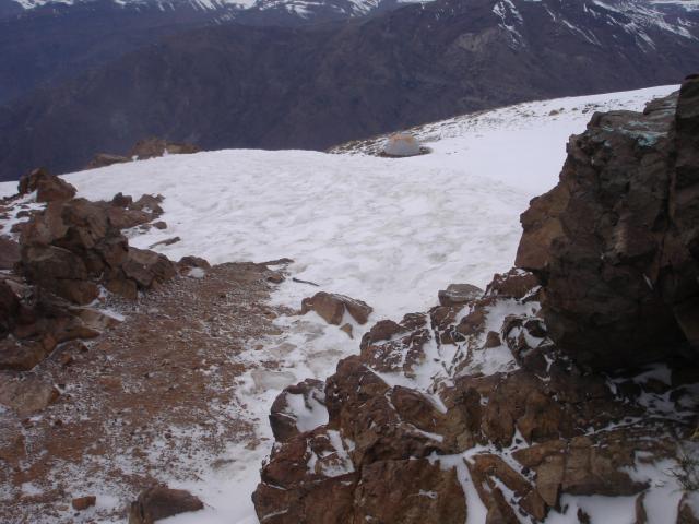 En la cumbre. Hace un frío yegua. El viento fuerte levanta la nieve que golpea la cara y se siente como agujas en la piel. Las manos duelen de frío y la cara se siente dura del frío.