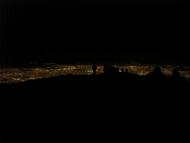 La silueta de algunos montaņistas se recorta contra las luces de Santiago