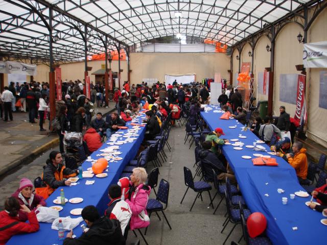Largos mesones y mucha gente en la calle techada, habilitada para la tallarinata. Erika Olivera tambié se prepara consumiendo carbohidratos...