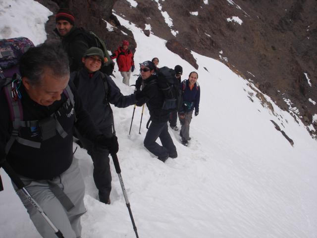 En la parte alta del nevero hay un poco de nervio y harto cansancio. La pendiente es fuerte y la nieve apenas permite marcar un lugar seguro para pisar. Lleguemos hasta aquí? Sí. Parece prudente, antes que se nos vaya alguien para abajo...(12:40)