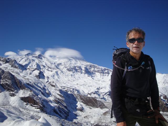 El San José detrás con sus nubes lenticulares. Yo llego transpirando después de la gran subida junto a Carola.