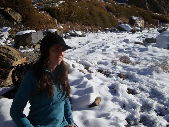Ya al pié del acarreo esperamos a los demás. Carola descansa y toma solcito.