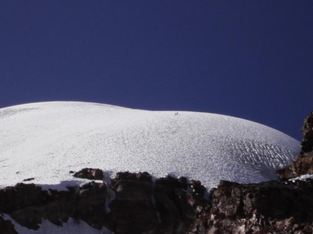 Francisco y Reinaldo vienen bajando desde la cumbre. Son las 9:52am La Vero que no siguó a la cumbre está esperandolos después de la zona expuesta que requiere pasar encordados.