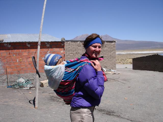 Vero ensaya el método andino de llevar las guaguas con "Kevin Costner" (nombre real del niño!!!!)