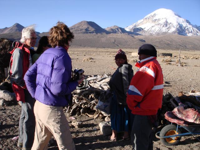 Reinaldo y su esposa Marķa negocian lana con la Vero. En la carretilla un llamo listo para la parrilla.