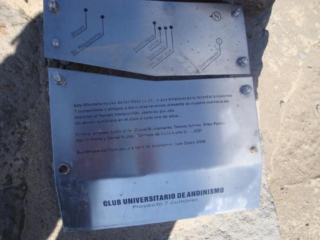 Placa qe recuerda la muerte de los 7 andinistas del CAU en el Illimani