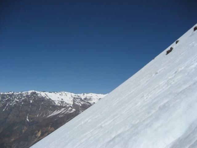 Llegamos al segundo plateau. Muy nevado. Subí un poco más, hasta que la nieve ya estaba un poquito dura. Subimos sin crampones ni piolet. Hasta aquí era sensato. Hay una tremenda pendiente. Bajo y nos juntamos en el plateau.