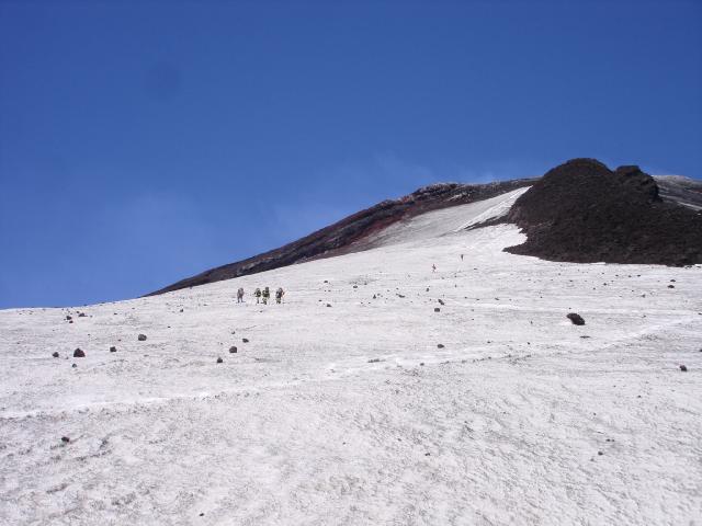 Los brasileños un poco más adelante, y más cerca del volcán dos deportistas que aparentemente suben por su cuenta van a gran velocidad.